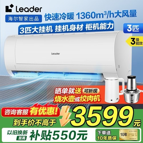 现在就为您推荐这款性能强劲、智能便捷的Leader海尔智家空调挂机,大3匹变频节能省电自清洁智能WIFI空调,原价4599元,目前在京东参与满减活动叠加优惠券后到手价仅需3594元,降幅高达5%,绝对是入手的好时机!这款空调采用双温差PID柔性变频技术和KTS毫秒级高频启动技术,实现15秒极速制冷、30秒快速制热,冷风上扬、暖风从足升起,舒适体验无死角。同时,它拥有三级能效标准,APF值高达3.69,节能环保且噪音低至21分贝,搭配56℃高温自清洁功能,确保出风洁净健康。不仅如此,通过智家APP远程操控,还能实现智能场景模式调节,适应-35℃至60℃极端环境稳定运行,额定制冷量7290W、制热量9370W,循环风量1360m³/h,性能表现十分强悍。无论家用还是客厅使用,这台空调都是您打造舒适生活的理想选择!喜欢的朋友千万不要错过!